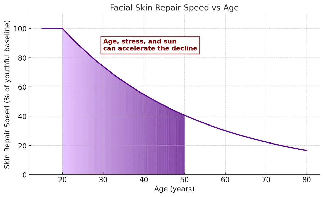 This graph portrays the decline of facial skin repair with age, outlining the influence of stress and sun damage as well. Ages 20-50 are especially critical as that is the only time period in our lifespans when we can alter the path of this decline.